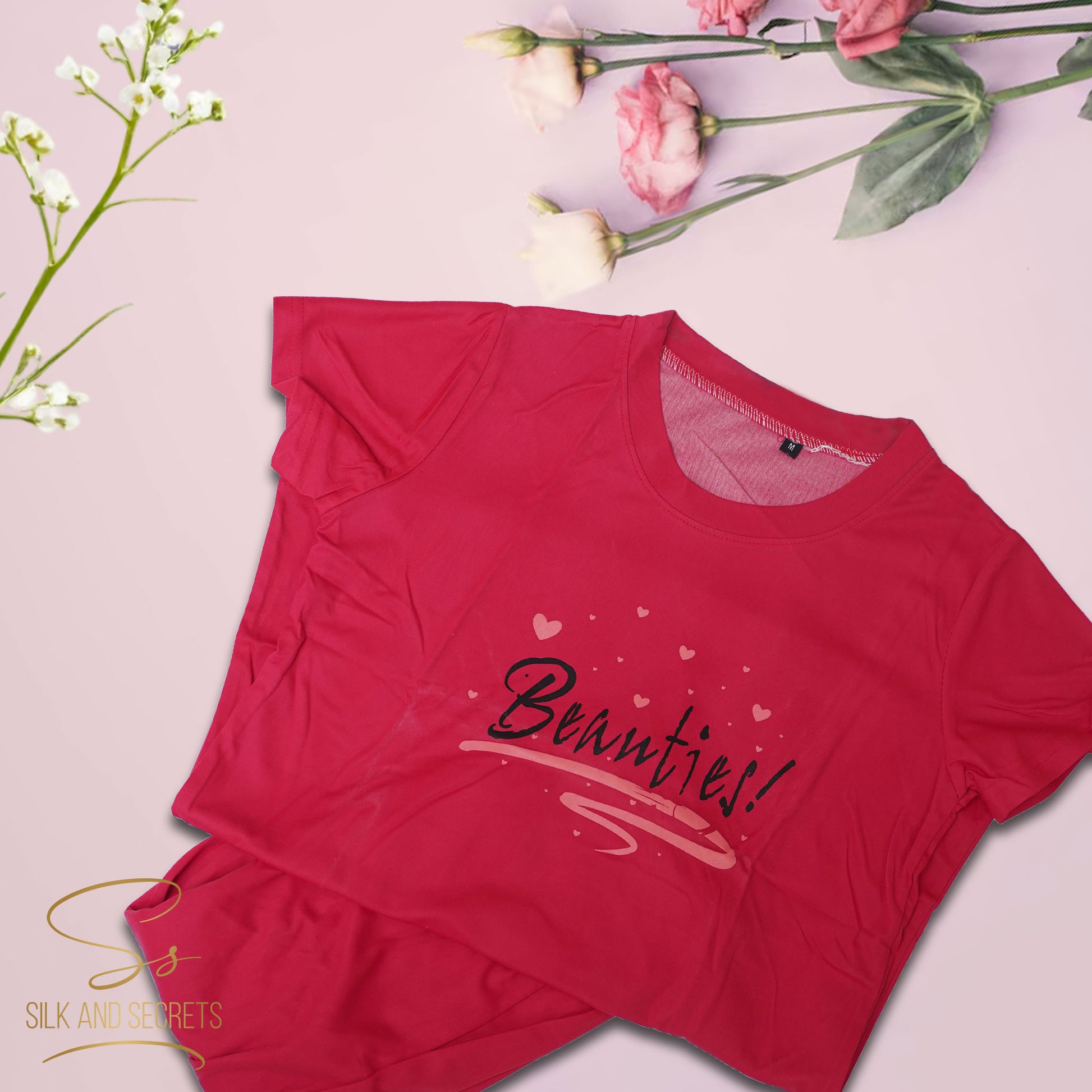 Trendy and comfy T-shirt with matching trousers, perfect for lounging or sleeping. The set is crafted in a bright pink shade, giving it a youthful and vibrant appeal. The T-shirt is short-sleeved with a round neckline, designed for ease and comfort. It has a stylish printed design on the front, with the word “Beauties!”.